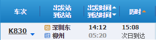 从深圳东站坐K830次列车到柳州站,用时15小时8分钟,每天有1个车次。