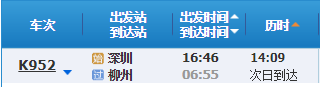 从深圳站到柳州站,搭乘K952次列车,用时14小时9分钟,每天有1个班次。