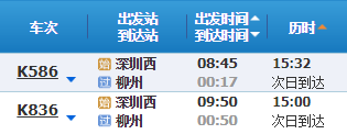 从深圳西站坐K586/K836次列车到柳州站,用时最短需要15小时,每天有2个车次。