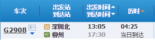 在深圳北站搭乘G2908次高铁列车到柳州站,用时4小时25分钟,每天有1个车次。
