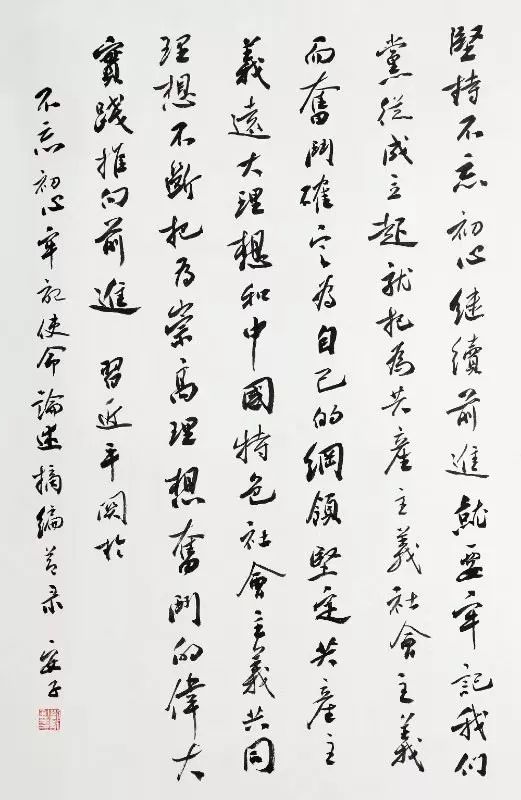 “不忘初心、牢记使命”主题书法展旨在用书法艺术反映和弘扬时代精神。本次展览参展作品56幅,均摘选自《习近平关于“不忘初心、牢记使命”论述摘编》。其中毛笔书法作品32幅、篆刻作品11幅、硬笔书法作品13幅。所有参展作品将结集出版《“不忘初心、牢记使命”主题书法展作品集》。