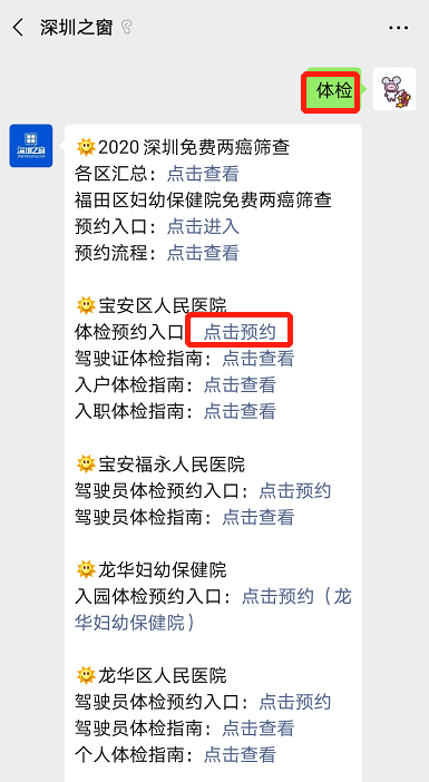 微信搜索或扫描文末二维码,关注【深圳之窗】公众号,对话框发送关键词【体检】即可获取医院体检预约入口;发送关键词【口罩】可获取深圳免费口罩预约入口。
