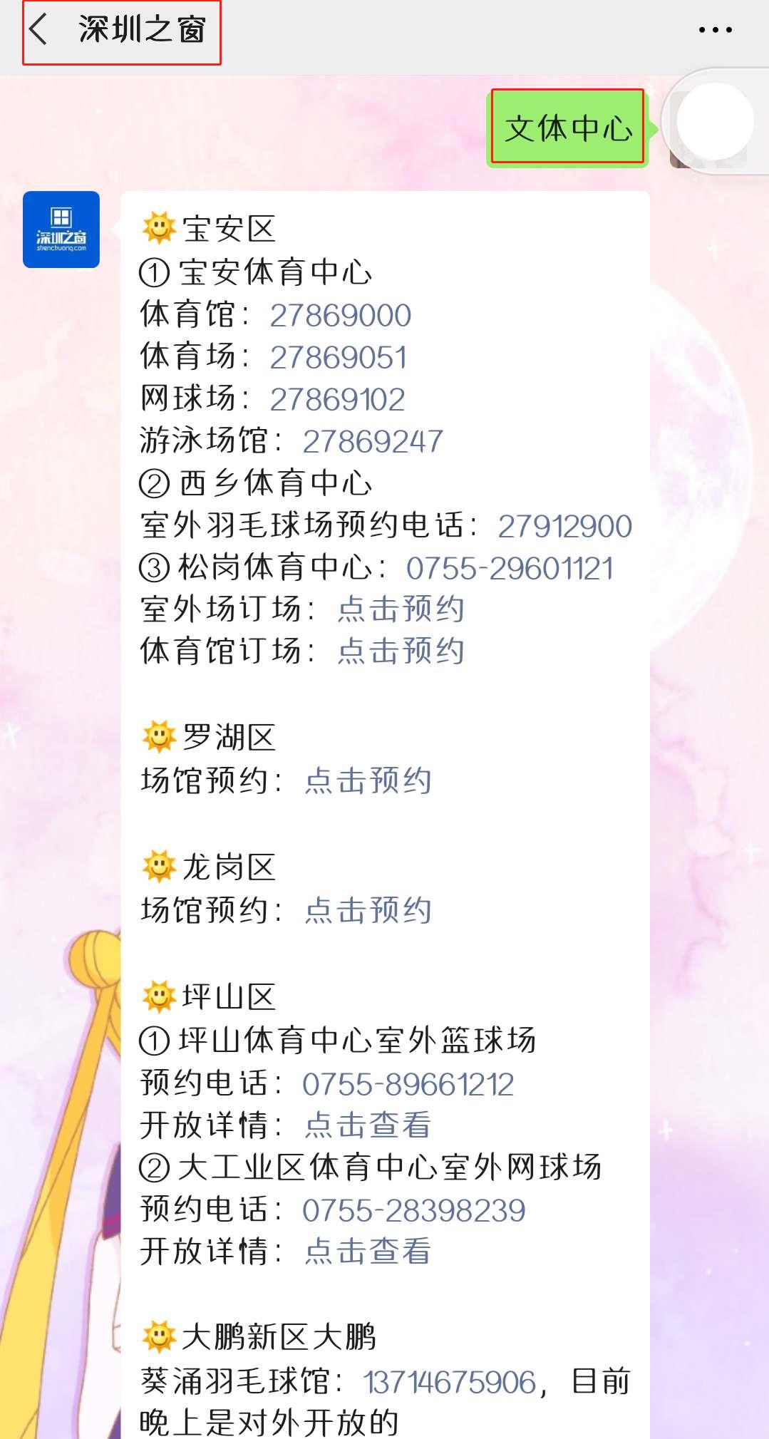 微信搜索关注【深圳之窗】公众号,对话框发送关键词【文体中心】即可获取深圳各区运动场馆预约入口。对话框发送关键词【自主申报】,即可获取深i您健康码申报入口。